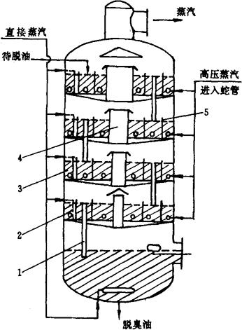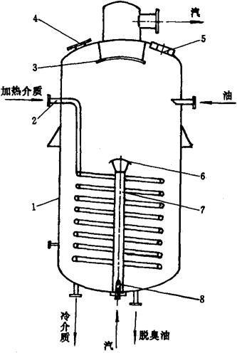 图1-3-40 脱臭罐 1-罐体 2-加热盘管 3-分离挡板 4-视镜 5-照明灯 6-碟形挡板 7-中央循环管 8-喷汽管 3.4.2 连续脱臭设备 连续脱臭设备包括脱臭塔、介质加热炉、脂肪酸冷却器、脂肪酸捕集器、冷却器、蒸汽喷射泵、过滤器等,其中脱臭塔是最主要的设备。图1-3-41所示为连续脱臭塔的一种形式。工作时经过预热的油由塔顶进入塔盘,沿着折流板形成的弯曲路线流动,然后从溢流管溢流至下层塔盘,逐次流到塔底。同时,由蛇形管内的高温介质将油加热到260~270℃时,开始喷入直接蒸汽进行蒸馏。蒸汽带走异味及脂肪酸,由塔顶进入脂肪酸冷凝器进行分离。成品油由塔底进入冷却器,使油温降到70℃,再进行精滤。油脂经过脱臭塔的时间约80min。直接喷汽量约为油量的4%。
