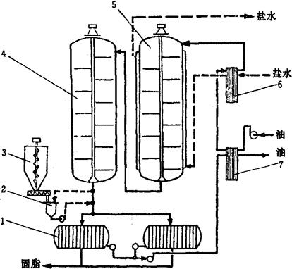 图1-3-42 连续冬化设备 1-密封过滤器 2-混合计量装置 3-助滤剂罐 4-养晶罐 5-冷却、结晶罐 6-油-盐水换热器 7-油-油换热器 冬化时,油经过连续二次换热器的冷却达到所设计的温度,进入冷却结晶罐。罐的夹套由循环盐水,保证按预定的冷却曲线进行冷却,为防止结晶沉积在冷壁上,罐内设有非常慢速旋转的搅拌刮刀。达到结晶温度后,油进入养晶罐,养晶罐的容积足以使油再滞留4~6h,并设有非常慢速转动的搅拌器。油通过养晶罐基本上完全达到结晶成熟,再送入密封过滤器过滤,将固脂和液体油分开。 |