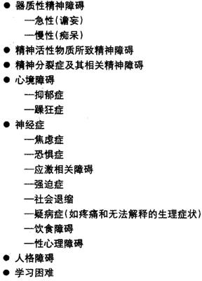 | 释义 | 精神异常的症状和分类 精神症状常伴有主观上的痛苦感觉或功能的损害。患者常因此就诊。有时,患者的行为会将自己置于险境或给他人带来不便,此时提示存在精神障碍。患精神病时,症状的轻重变化很大,轻者与正常人差异不明显,重者功能完全丧失。精神症状有时被归结于神经症状,如焦虑、沮丧等。精神病指的是出现了与正常行为性质不同的症状。视觉常常受累,对患者完成其各种功能有很大影响,如幻觉和妄想(见270页,“精神状态的检查”)。这此症状见于谵妄和精神分裂。谵妄和精神分裂是两种不同的精神异常,其区别见精神病的分类。精神病是根据主要症状进行分类的。如病人明显有多种症状,诊断的精神异常不止一种,应按病情重的进行诊断。具体的诊断顺序见表40。例如,如果病人同时有很明显的焦虑症状又有精神分裂的症状,第一诊断应为精神分裂。 表40 不同类型的精神异常举例