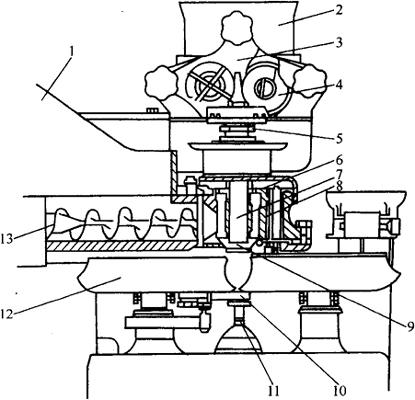 图3-5-1 包馅机成形原理图 1-面料斗 2-馅料斗 3-输馅双绞龙 4-双叶片泵 5-输馅管 6-输面竖绞龙 7-馅料嘴 8-面料嘴 9-复合喷嘴 10-拨杆 11-托盘 12-成形盘 13-双水平输面绞龙 4.机构特点 该机通用性强、可包各类馅料,而且皮馅比可调。 (二)自动成形机 1.用途 该机是与包馅机配套使用的,可做多类糕点的成形设备。 2.组成 主要由成形部件(包括上、中、下模)、饼坯送入传送带、饼坯成形传送带及成形后饼送出体送带、传动装置、气压控制装置等组成。 3.工作原理 成形原理见图3-5-2。该机运行过程是:由包馅机送入的球状饼坯经送入传送带送至成形传送带。由气动元件控制的上模开始下行,把饼坯连同此时间歇停转的传送带一起压入由中模和下模组成的模腔内,由于在上模的下表面和中模的侧表面都刻有成形图案,因此,饼坯即被挤压成形。成形后,上模上升,下模也随之上升,把成形后的饼坯及成形传送带推出模腔。然后成形传送带开始运动。把成形后饼坯移入送出传送带。该机的成形模可以更换,以满足成形大小、形状不同的饼坯需要。