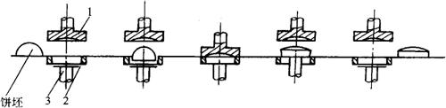 图3-5-4 自动蛋卷机原理图 1-蛋卷绕制芯杆 2-上加热元件 3-加热罩板 4-下加热元件 5-贮浆斗 6-上浆板 7-加热辊筒 8-卷筒帆布带 9-回转刀架 10-圆片切刀 面浆从贮浆斗底部流出,沿上浆板向下流动,被均匀地撒布到加热辊筒表面上。辊筒表面应预热,当浆料接触到高热的辊筒后,便形成一层固化膜即蛋卷皮。烤制好的蛋卷皮随帆布带输送至导辊,导辊位于上、下帆布带中间,并与帆布带运动方向呈45°角,由于导辊的旋转及帆布带动135°转向,使蛋卷被卷制成连续多层的螺旋状长条蛋卷。长条蛋卷经冷却定型出后,通过做复合旋转运动的圆盘切刀来进行定长割,最后作为蛋卷成品被输送带送出。 (五)桃酥成形机 1.用途 生产桃酥时用于成形的专用设备。 2.组成 桃酥成形方式有辊印与冲印两种。前者与辊印式饼干成形机的结构、工作原理一致。只是印模的规格尺寸不同。而冲印式桃酥成形机有所不同,它的组成由供料机构、成形机构、脱模机构、烤盘输送机构及传动机构等组成。 3.工作原理 工作原理及过程如图3-5-5所示。 桃酥的成形模加工在一回转模辊上,模辊按相同夹角沿轴向开有数个模孔,模孔的直径按产品规格而定。工作时,将调制好的面团送入料斗,通过输面辊的回转,将坯填入模孔内,然后通过间歇传动机构使回转模辊沿周向转动一个孔位。在回转模辊停转的时间内,由压紧凸轮带动压紧板上的冲印柱塞将桃酥坯料压紧。同时,脱模凸轮带动活动模柱运动,将成形后的桃酥饼坯从模孔中冲出,落在烤盘中。当处于压紧和脱模位置上的冲印柱塞和活动柱塞上升并复位后,回转模辊又开始转动。在此同时,烤盘输送链带动烤盘向前移动一个工位。