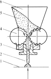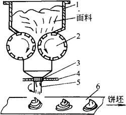 图3-5-7 MSJE10(Ⅱ)万能制点心机 1.用途 该机适合于高油脂面团的成形,可用于制作各类曲奇饼及桃酥。 2.组成 该机主要由喂料成形机构、控制调节机构、传动机构等部分组成。 3.工作原理 该机靠挤压作用成形,其挤压力来自一对喂料辊的间歇转动,将面团向下推送,使面团从位于喂料辊下方的喷嘴中挤出,落入下面的烘盘上,形成所需的饼坯。其工作原理见图3-5-8所示。通过更换不同形状的喷嘴和调整控制调节机构,就可得到多种不同形状的饼坯。