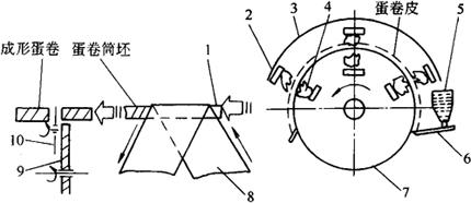 图3-5-3 软料糕点成形机 1-料斗 2-喂料辊 3-齿轮 4-齿条 5-喷花嘴 6-传送带 将调制好的面料放入料斗中,通过一对喂料辊的相对旋转,使得喂料辊下方的腔体形成压力腔,从而将面料挤向喷花嘴,挤出在上升的烤盘上。喷花嘴可通过齿轮3和齿条4带动旋转,使挤出的生坯呈螺旋状花纹;若花嘴不转,仅使烤盘直线前进,也可制出带条状花纹的饼坯。 料斗为长方形,喂料辊的轴向尺寸与料斗长度一致,喷花嘴横向排列,一次挤花,便可生产出一排形状相同或形状各异的生坯。 该机还可安装割刀架,割刀是一根可以往复运动的水平钢丝,当软料从花嘴挤出一定量时,水平钢丝运动将其沿喷嘴端面割断,即得到长条切割生坯,这种方法称为钢丝切割成形。 4.机构特点 该机构通过更换不同喷花嘴,配合机器的不同动作,能够生产出多种形状的软料糕点,由于产量适中,适合中、小型糕点制作厂家配套使用。 (四)自动蛋卷机 1.用途 制作蛋卷。 2.组成 自动蛋卷机主要由上浆装置、加热装置、卷制成形装置及传动系统等组成。 上浆装置由贮浆斗、上浆板、加热辊筒组成;加热装置包括上、下加热元件、加热罩及排潮装置等,加热方式分为煤气和电加热两种;卷制成形装置由135°转向帆布带、与帆布带成45°角的辊及旋转同步切刀等组成。 3.工作原理 工作原理及过程如图3-5-4所示。