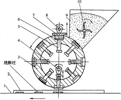 图3-5-5 冲印式桃酥成形机 1-烤盘输送链条 2-烤盘 3-回转模辊 4-脱模凸轮 5-压簧 6-活动模柱 7-压紧板 8-压紧凸轮 9-料斗 10-输面辊 4.机构特点 生产的桃酥饼坯具有形状整齐、质量准确、生产率高、卫生条件好等优点。 (六)蛋糕浇模机 1.用途 在制蛋糕时将面浆均匀浇注在烤盘上的模腔内。 2.组成 由面浆斗、面浆定量装置、浇注控制装置、传动装置等组成。 3.工作原理 该机构利用蛋糕面浆易于流动的特性,利用真空吸力和挤压力将料斗内的面浆挤注至烤盘上的蛋糕模内。其原理如图3-5-6所示。