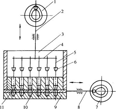 图3-5-6 蛋糕浇模机原理图 1-柱塞连杆驱动凸轮 2-柱塞连杆 3-面浆斗 4-柱塞杆横梁 5-柱塞杆 6-柱塞 7-控制板连杆驱动凸轮 8-控制板连杆 9-蛋糕烤盘 10-控制板 11-定量板 将调制好的面浆送入面浆斗中,这时控制板的进浆孔与上面的定量板的定量孔及下面的蛋糕烤盘模孔错开,这样,定量板的定量孔中充满面浆。然后,柱塞连杆驱动凸轮带动柱塞连杆连同柱塞杆横梁、挤浆柱塞一同向下移动。与此同时,控制板连杆驱动凸轮带动控制板移动,使定量板与烤盘模间形成通路。挤浆柱塞将定量面浆压入蛋糕烤盘的模腔内。接着,控制板连杆驱动凸轮带动控制板移动,将定量板与蛋糕模孔的通路断开,柱塞杆上移,面浆又充入定量板的定量孔中,下一个循环接着进行。 (七)MSJE10(Ⅱ)万能制点心机(图3-5-7)