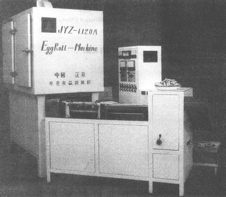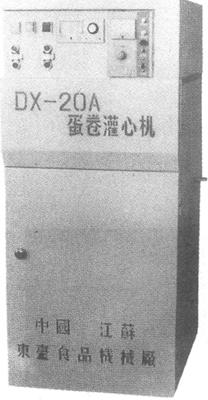 图3-5-11 JYZ-1120A型自动蛋卷机 1.用途 采用远红外线烘焙蛋卷。 2.技术特性 生产能力:20~30kg/h; 电机功率:27kW; 外形尺寸:Ⅰ型为1560mm×940mm×2035mm; Ⅱ型为1610mm×960mm×1350mm; 蛋卷规格:Ⅰ型Φ20mm×60mm; Ⅱ型Φ20mm×80mm; Ⅲ型Φ20mm×120mm; Ⅳ型Φ20mm×160mm; 总重量:1300kg 3.制造单位 江苏东台食品机械厂。 (十一)DX-20A蛋卷灌芯机(图3-5-12)