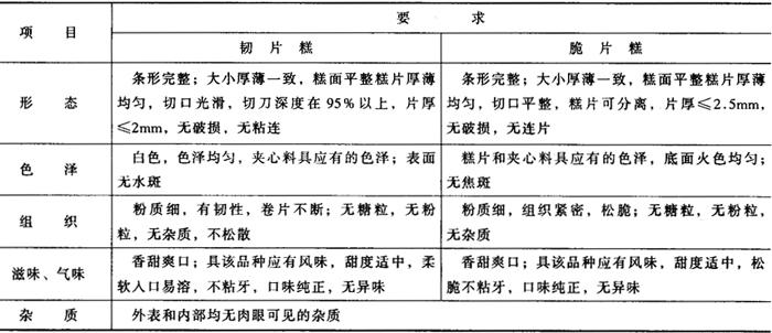 3.要求 按标志重量,公差允许±4%。 4.卫生要求 蛋糕的卫生要求应符合GB 7099-1998的规定,见表4-1-34。 (二)片糕质量技术标准(SB/T 10031-1992) 本标准适用于以米粉为主要原料,经炒制、混合、成形、烘焙等加工而成的薄片类制品。 韧片糕,将各原辅料经混合、水蒸、切片而成,制品有韧性,可弯曲。 脆片糕,将各原辅料经混合、成形、烘焙而成,制品有脆性。 1.感官要求 片糕的感官要求见表4-1-39。 表4-1-39 片糕感官要求