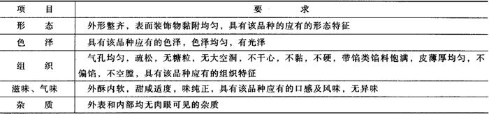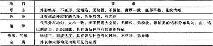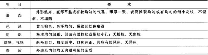 3.重量要求 按标志重量,公差允许±3%。 4.卫生要求 桃酥类糕点的卫生要求应符合GB 7099-1998的规定,见表4-1-34。 (四)烘焙类糕点质量技术标准(SB/T 10222-1994) 1.本标准适用范围 本标准适用于烘焙为最后熟制工序的各种焙烤食品。按其加工工艺不同,可分为12类。 (1)酥类糕点:使用较多的油脂和糖,调制成塑性面团,经成形、烘焙而制成的组织不分层次,口感酥松的制品。 (2)松酥类糕点:使用较少的油脂,较多的糖(包括砂糖、绵白糖或饴糖),辅以蛋品、乳品等并加入化学膨松剂,调制成具有一定韧性,良好可塑性的面团,经成形、烘焙而制成的酥松的制品。 (3)松脆类糕点:作用较少的油脂,较多的糖浆和糖调制成糖浆面团,经成形、烘焙而制成的口感松脆的制品。 (4)酥层类糕点:用水油面团包入油酥面团或固体油,经反复轧片、折叠、成形、烘焙而制成的具有多层次、口感酥松的制品。 (5)酥皮类糕点:用水油面团包油酥面团制成酥皮,经包馅、成形、烘焙而制成的饼皮分层次的制品。 (6)水油皮类糕点:用水油面团制皮,然后包馅,经烘焙而成的皮薄馅饱的制品。 (7)糖浆皮类糕点:用糖浆面团制皮,然后包馅,经烘焙而制成的口感柔软或韧酥的制品。 (8)松酥皮类糕类:用松酥面团制皮,经包馅、成形、烘焙而制成的口感酥松的制品。 (9)硬酥皮类糕点:使用较少的糖和饴糖,较多的油脂和其他辅料制皮,然后包馅,经烘焙而制成的外硬内酥的制品。 (10)发酵类糕点:采用发酵面团,经成形或包馅成形、烘焙而制成的口感柔软或松脆的制品。 (11)烘糕类糕点:以糕粉为主要原料,经拌粉、装模、炖糕、成形、烘焙而制成的口感松脆的糕点制品。 (12)蛋糕:以鸡蛋为主要原料,经打蛋、注模、烘焙而制成的组织松软的制品。 2.感官要求 烘焙类糕点感官要求见表4-1-43。 表4-1-43 烘焙类糕点感官要求