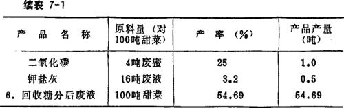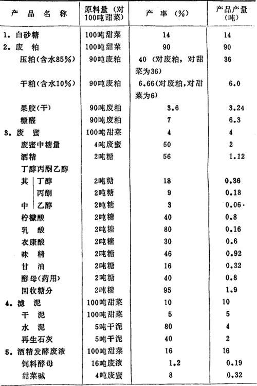 注:表中产率系对第二栏中的原料量而言,产品产量系对100吨甜菜而言 |
