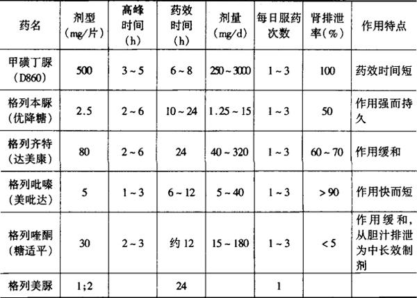 3.慢性并发症的诊断:病史5年以上,或青春期后的糖尿病1型病人和所有的糖尿病2型病人,均应确定有无糖尿病慢性并发症。 【治疗要点】 目前强调早期治疗、长期治疗、综合治疗、治疗措施个体化的原则。 1.一般治疗:对糖尿病患者进行教育是重要的基本治疗措施之一。让患者了解糖尿病的基本知识的治疗控制要求。生活应规律,戒烟和烈性酒,讲究个人卫生,预防感染。 2.饮食治疗:是一项重要的基础治疗措施,应严格和长期执行。 (1)制定总热量:首先计算出理想体重[理想体重(kg)=身高(cm)-105],然后根据患者实际体重及平时从事的劳动量,计算出每日所需热量。成年人每日每千克理想体重给予热量104~125kJ,轻体力劳动125~146kJ,中度体力劳动146~167kJ,重度体力劳动167kJ以上。儿童、孕妇、营养不良者以及伴有消耗性疾病者适当加量,肥胖者适当减量,使体重恢复到理想体重的±5%左右。 (2)营养物质含量:碳水化合物占总热量的50%~60%,蛋白质一般不超过15%,脂肪占30%左右。糖尿病肾病肾功正常者患者蛋白质应限制在0.8g/kg·d,血尿素氮升高者,应限制在0.6g/kg·d。每克蛋白质、碳水化合物均产热17kJ,每克脂肪产热38kJ。 (3)合理分配:可将每日三餐分为1/5、2/5、2/5或1/3、1/3、1/3;也可按4餐分为1/7、2/7、2/7、2/7。 3.体育锻炼:应进行规律适当的运动。1型糖尿病患者应餐后进行,运动量不宜太大,持续时间不易太长。2型糖尿病患者尤其肥胖者,适当运动可有利于减肥,可减轻胰岛素抵抗。但有老年患者,眼底病变者,心、脑血管疾病者,应视具体情况而定。 4.口服降糖药物治疗:主要有以下4种: (1)磺脲类药物:主要降血糖机制为通过药物与B细胞膜的钾离子通道相结合,使B细胞去极化,细胞内钙离子增加,而触发胰岛素释放。适应于单纯饮食控制和体育锻炼血糖仍不理想的2型糖尿病尤其是胰岛素水平较低或分泌延迟者。副作用主要是低血糖,其他副作用有恶心、呕吐、消化不良、溶血性贫血、血小板减少、皮肤瘙痒、皮疹、肝功损害、白细胞减少等。常用药物特点见表4-12: 表4-12 常见的磺脲类药物及其作用特点