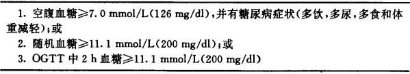 | 释义 | 糖尿病 【释义】: 糖尿病(diadetes mellitus)是因胰岛素分泌、胰岛素作用或两者同时存在缺陷所致的以慢性高血糖伴有糖类(碳水化合物)、脂肪和蛋白质代谢紊乱为特征的一组代谢性疾病。糖尿病对人体的长期影响主要是造成各种器官的功能损伤,包括不断进展的血管性疾病(即可引起失明的视网膜病变,引起肾功能衰竭的糖尿病肾病,及不断增加的心血管、脑血管和周围血管病的危险)和神经病变(可累及周围神经和自主神经)。糖尿病最严重的急性并发症是酮症酸中毒及高渗性昏迷,危害健康,甚至生命。 【诊断】: 1.临床表现 典型者有“三多一少”症状,即多饮、多尿、多食、消瘦,不少患者缺乏典型临床症状,表现为反应性低血糖,或某些急慢性并发症的症状。 2.辅助检查 (1)血糖测定 空腹及餐后血糖升高是诊断糖尿病的主要依据。空腹静脉全血血糖(真糖法)的正常值为3.3~5.6mmol/L(60~100mg/dl),血浆血糖正常值为3.9~6.4mmol/L(70~110mg/dl)。 (2)口服葡萄糖耐量试验 可疑糖尿病,空腹及餐后血糖增高但未达到糖尿病诊断标准者应行此试验。成人采用75g葡萄糖负荷,儿童1.75g/kg,正常人血糖高峰出现于服糖后1/2~1h,峰值不超过8.9~10mmol/L(160~180mg/dl)。 (3)空腹血浆或血清胰岛素及C肽测定 采用放射免疫法测定的胰岛素包括胰岛素原及与抗体结合的胰岛素。C肽测定不受胰岛素抗体影响,不与胰岛素产生交叉免疫反应,也不受外源性胰岛素干扰。1型糖尿病空腹血浆胰岛素和C肽水平很低,2型糖尿病则多为正常或增高。 (4)胰岛素或C肽释放试验 本试验的方法与OGTT相同,只是于空腹,服糖后30,60,120,180min时采血同时测胰岛素或C肽,以直接了解胰岛β细胞的功能状态。正常人血胰岛素和C肽的高峰与血糖高峰一致,于服糖后30~60分钟胰岛素测值为空腹的5~10倍,C肽测值为空腹的5~6倍。1型糖尿病患者糖负荷后无胰岛素和C肽释放反应峰,其释放曲线呈低平状态;2型糖尿病肥胖患者,糖负荷后胰岛素和C肽释放反应峰值正常或增高,但高峰却在2h后延迟出现;病程已久消瘦2型糖尿病患者胰岛素和C肽的释放反应峰值低于正常。 (5)糖基化血红蛋白测定 糖基化血红蛋白(GHb)含量与血糖浓度呈正比,可反映2~3个月前体内血糖的平均水平。糖基化血红蛋白的主要成分为HbAlc,因此常以HbAlc代表GHb。GHb(或HbAlc)的测值因测定方法不同而略有差异,约在3.6%~6.3%的范围之内。未控制的糖尿病患者GHb可为正常人的2至3倍。 (6)糖化血清蛋白测定 葡萄糖与血清蛋白和其他蛋白质亦可发生非酶糖化反应,使白蛋白等蛋白质N-末端上形成酮胺结构,类似果糖胺,因此又将糖化血清蛋白测定称为果糖胺测定,其含量亦取决于血糖浓度,可反映受试者2周前的血糖平均浓度。正常值依方法和实验室不同略有不同,需参照各实验室制定的标准。 (7)自身抗体测定 自身抗体包括胰岛细胞抗体(ICA)、胰岛素抗体(IAA)及谷氨酸脱羟酶(GAD)抗体测定。1型糖尿病患者血清中该三种抗体可同时存在,亦可仅测到1~2种。三种抗体中GAD存在的时间较长,于发病10余年后仍可测到该抗体。 (8)其他检查 有关糖尿病并发症的实验室检查,包括血脂、血黏度;脑、心、肾血管病变及功能检查见有关章节。 3.糖尿病的诊断标准 1996年ADA提出的新诊断标准,见表8-2。 表8-2 ADA糖尿病诊断新标准(1996年)