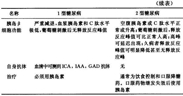 4.诊断 糖尿病的诊断包括确定糖尿病、糖尿病分型和并发症的诊断。 (1)确定糖尿病的诊断 典型病例,出现多饮、多尿、多食及体重减少的三多一少症状。结合血糖测定,若符合前述诊断标准,即可作出诊断。三多症状不明显,中年以上肥胖的轻症患者,往往以某种并发症或伴随症而就诊,若随时警惕本症,及时进行血糖测定或糖耐量试验,即可早期得到诊断。 (2)糖尿病的分型 糖尿病一旦确定,则应进行分型诊断。糖尿病分型诊断关系到治疗方案的选择,因此十分重要。原发性糖尿病的两种主要类型,即1型糖尿病和2型糖尿病是两种不同病因所致的疾病,有着不同的病理生理特点,以及临床特点和表现形式。1型和2型糖尿病中,不同的临床特点和鉴别要点见表8-3。 表8-3 1型和2型糖尿病的特点和主要区别