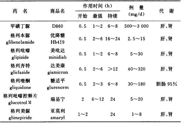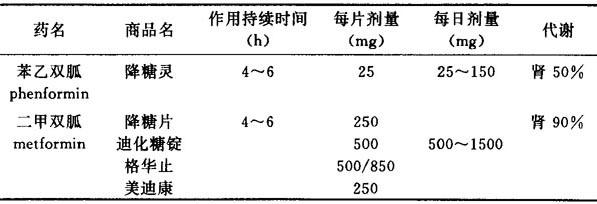 ●各种磺脲类药物的作用强度不同,但经调整每片剂量后,每片降糖效果基本相当。优降糖的降糖效果较其他药物强。 ●达美康对预防心血管并发症或心血管危险因子(血脂、血小板功能、血液流变学)有良好作用。 ●糖适平因主要从胆管系统排出,轻、中度肾功能不全者可选用此药。 ●磺脲类药物使用不当可发生低血糖,应从小剂量开始。优降糖和达美康作用时间长,若用量过大,进食过少,肾功能减退,易出现低血糖。 ●磺脲类药物偶可引起皮疹、肝功能受损等。 2)双胍类降糖药 双胍类药物可减少肠道对葡萄糖的吸收,抑制糖原异生从而减少肝糖输出;增加机体对胰岛素的敏感性,从而增加外周组织对葡萄糖的摄取和利用,达到降糖目的。双胍类药物在高血糖状态下有降糖作用,但对正常血糖无降糖作用,故不引起低血糖。以胰岛素抵抗为主的糖尿病患者,特别是肥胖的2型糖尿病患者治疗应首选双胍类药物;非肥胖2型糖尿病患者用磺脲类药物不能满意控制血糖时可加用双胍类药物。1型和2型糖尿病患者使用胰岛素治疗时若联合应用双胍类(表8-8),不仅可增加胰岛素的降糖作用,减少胰岛素用量,并可减少血糖不稳定者的血糖波动。 表8-8 常用双胍类药物表