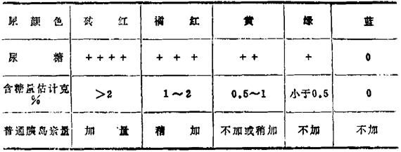 开始先用正规胰岛素,每天量一般10~60单位,开始可按0.5~1单位/公斤/日,分3~4次,饭前30分钟注射,也可按尿糖程度增减,每次饭前测尿糖1次,每个(+)号用胰岛素4单位左右。尿阴性后可改用长效精蛋白锌胰岛素,每天1次,病情稳定后可逐渐减量。需根据年龄确定用药量。尿糖估计方法,可用40~60滴斑氏试剂,加尿4~6滴,看其颜色变化,以估计尿糖。 尿量估计方法