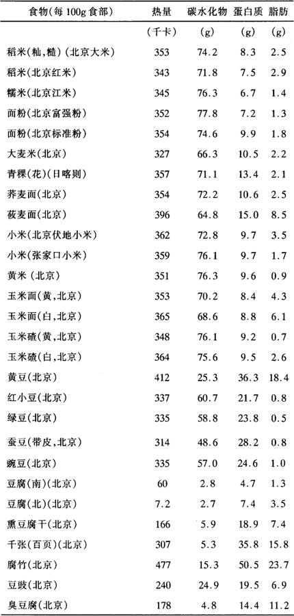 | 释义 | 糖尿病 糖尿病是现代医学名称,大致相当中医所说的消渴。但有一部分消渴不是糖尿病。本节糖尿病指临床糖尿病(显性或症状性糖尿病)。 即有明显糖尿及血糖升高的病人。临床以口渴多饮、消谷易饥,尿多而甜,形体渐见消瘦为主要证候。轻症糖尿病可单纯通过饮食控制,重症或有合并症时适当饮食是药疗的重要辅助、配合措施。 中医消渴分为消渴(上消)、消谷(中消)、消肾(下消),合称三消。多饮水,少食为上消,病在肺;渴而善食,溲多味甜为中消,病在胃;溺浊如膏为下消,病在肾。上消较轻,下消最重。 糖尿病关键在于糖代谢障碍,现代医学即使给予药物治疗,亦须严格控制饮食,根据机体的具体情况以及药物剂量、效应,应该较准确地限制碳水化合物摄入量。但此量应该经过专科医生计算,并经一段临床观察,最后确定。一般家庭应取得专科医务人员帮助、指导。 不得已时,自行控制饮食亦须渐进,不要贸然过量减少碳水化合物摄取量,以免加重患者饥饿感,或诱发酸中毒、低血糖。如果自己有尿糖试纸,尿糖控制在(±)或(+)应是适量,仍需经常测试。当病情减轻时,饮水及尿量均可减少接近正常,可以作为自己观察的指标。 (一)饮食原则 1、总的原则是饮食节制和清淡。节制在于控制食量,特别是碳水化合物(淀粉、糖类)的摄入量,植物纤维虽然也是多糖类,但人类对植物纤维没有消化能力,不在限制之列,反而用以充饥。清淡即禁忌辛辣、厚味、甜腻、烟酒以及其它耗气、伤阴之属。 2、糖尿病人抵抗力、免疫力下降,这一时期注意预防皮肤感染为要务,防免胃肠道感染也十分重要,饮食卫生尤应注意。 3、晚期糖尿病人肾功能障碍者应参照慢性肾炎饮食宜忌;合并冠心病者,应参照冠心病饮食宜忌。 (二)饮食宜忌 1、谷、麦可以食用,但碳水化合物量及热量应计算。还要注意保证人体基本热量供给。 正常健康人每日热量需要,据中国生理科学会第三届营养学术会议暨营养学会成立大会(1981)修订标准:男:2,400~3,400千卡;极重体力劳动4.000千卡;女:2,200~3,400千卡;孕妇加300千卡,一年内乳母加800千卡;少年男、女:2,300千卡~2,800千卡;儿童1.100~2,200千卡;1岁以下小儿每kg体重100千卡,6个月以下小儿每kg,体重120千卡。每克碳水化合物或蛋白质按产热4千卡计算,每克脂肪按9千卡计算。 据中国医学科学院卫生研究所《食物成分表》(人民卫生出版社1989)食物热量、碳水化物、蛋白质、脂肪含量如附表1: 附表1 常用食物的热量、碳水化合物、蛋白质、脂肪含量