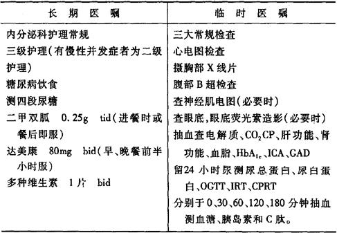 (2)空腹血糖值超过17mmol/L,可先用胰岛素控制血糖,从小剂量开始(每kg体重给2~3U/d)。尿糖测定时每增加1个加号(+)的尿糖,胰岛素剂量增加2~4U,尿糖阴性后根据血糖水平调节胰岛素剂量;体重超重或肥胖者可辅以二甲双胍。血糖控制基本正常后,可逐渐将胰岛素改为口服降糖药。