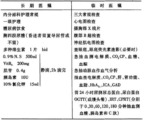 说明:(1)糖尿病酮症酸中毒(DKA)是内分泌科常见急症之一,一旦发生,应积极治疗。 (2)输液是抢救DKA首要而关键的措施,开始时宜快,第1个24小时输液量4000~5000ml(无心、肾功能障碍者);血糖>16mmol/L,只用生理盐水,胰岛素按0.1U/(kg·h),或4~6U/h给予,注意补钾;血糖<16mmol/L,可适当用5%葡萄糖水,并按2~6g糖1U胰岛素配制,即5%G.S500m1+10~12U胰岛素静滴。 (3)动脉血气检测结果,如pH下降至7.0~7.1,CO2CP4.5~6.7mmol/L,应适当补充5%碳酸氢钠84ml,并稀释成1.25%的溶液,即0.9%N.S250ml+5%碳酸氢钠84ml,静滴时注意同时补钾。 (4)酮体消失、血糖下降平稳后,能进食可适当给予胰岛素皮下注射,并根据血糖调整胰岛素剂量。 |