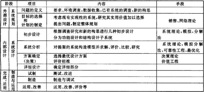 | 释义 | 系统分析 系统分析是为了对现有系统的改进和控制,或是为了明确新设计系统实现最佳过程的分析方法。由表2.1.2-1系统建立过程可知,在系统规划阶段,主要的是定义系统的概念,明确建立系统的必要性,并在此基础上明确目的和确定目标,同时提出系统应具备的环境条件以及各种制约条件。在系统设计阶段,首先对系统进行初步设计,其内容主要是建立各种可行方案,然后进行系统分析。系统分析的项目包括目的、替代方案、费用和效益、模型及评价,最后确定系统设计方案,据此对系统进行详细设计。第三阶段是制造与运用,对系统的设计中与系统有关的关键项目作必要的试验、试制和改进,并进行工艺设计。 表2.1.2-1 系统的内部设计和外部设计