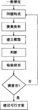 由此可见,系统分析在整个系统建立过程中起到承上启下的作用,特别是当系统中存在不确定的相互矛盾的因素时,更需要建立相应的模型和进行仿真试验,为进一步决策提供必需的信息和依据;尤其是对技术比较复杂、投资费用比较大、建设周期比较长的工程项目,系统分折则是必不可少的一环。只有这样,才能保证获得最优的系统设计方案,避免在实施时,大量返工和经济上的重大损失。 系统分析的要素,有目的、替代方案、费用和效益、模型和评价标准等。其中,目的是决策的出发点。为了正确获得决定最优系统方案所需的各种有关信息,系统分析人员的首要任务就是要充分了解建立系统的目的和要求。系统的目的和要求既是建立系统的根据,也是系统分析的出发点。只有全面正确地理解和掌握系统的目的和要求,才能进一步分析系统,设计系统。 所谓替代方案,就是在初步设计阶段可以构思出为达到同一目的的各种不同方案。例如,设计防空系统时,可以构思出地下防空设施系统方案,也可以设计出高炮射击系统,自然也可采用战斗机迎击方案。一般情况下,就是根据多种方案的利弊,进行分析和比较,从中选择最佳方案。 建立任一系统都需要投资,一旦系统建成后就会产生效益,所以,费用-效益分析总是用来作为选择设计方案的指标。而模型则是描述系统和过程的某一方面本质属性的,它是对客观世界抽象的表述,可以将复杂的问题简化为易于处理的形式,同时还可以用比较方便的形式在决策之前预测出结果。要素中的评价基准,是评价各替代方案优劣的指标。评价基准一般根据系统的具体情况而定。 系统分析的步骤如下: 1.问题的构成。当某系统提出之后,首先要对所需解决的问题进行合乎逻辑的分析。其目的在于确定目标,说明问题的重点和范围,以便进行分析研究。 2.搜集资料。在问题构成之后,就要拟定大纲和决定分析方法,然后依据已搜集的有关资料找出其中的相互关系,寻求解决问题的各种可行方案。 3.建立模型。预测每一方案可能产生的结果,定量说明各方案的优劣与价值。 4.判断。利用资料和模型分析所获得的结果与实际情况加以比较,以便决定行动方针。 5.检验核实。以试验、抽样、试行等方式鉴定所得结论,提出应采用的最佳方案。 在分析过程中可利用不同的模型,在不同的假定下对各种可行方案进行比较,获得结论,提出建议。但是否实行,则是决策者的责任。整个系统分析的步骤大体如图2.1.5-1。