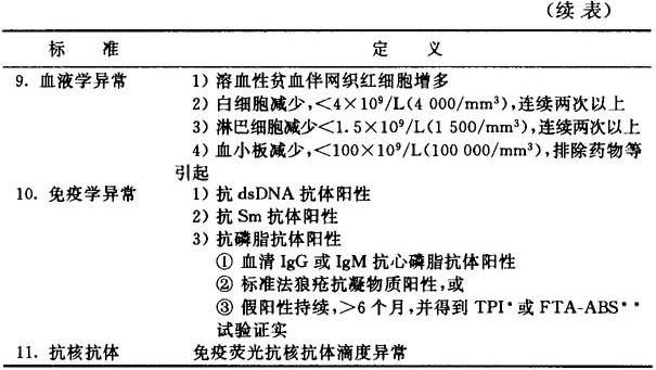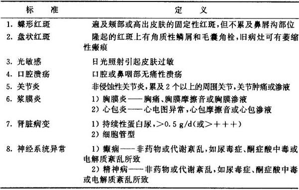 | 释义 | 系统性红斑狼疮 【释义】: 红斑狼疮系自身免疫病,多见于育龄期妇女,女性是男性的10倍。它可被看作为病谱性疾病,谱的一端为盘状红斑狼疮(discoid lupus erythemato-sus,DLE)和慢性皮肤型红斑狼疮(chronic cutaneous lupus erythemato-sus,CCLE),病变限于皮肤。谱的另一端为系统性红斑狼疮(systemic lupus erythematosus,SLE),病变累及多系统、多脏器,并伴有多种自身抗体。病谱中间有多种亚型,如播散性DLE,亚急性皮肤型红斑狼疮(subacute cuta-neous lupus erythematosus,SCLE),深在性红斑狼疮(lupus erythematosus profundus,LEP)又称狼疮性脂膜炎(lupus pannicuhtis,LP)等。临床上常见的是SLE。 【诊断】: 1.临床表现 SLE的表现多样,可累及皮肤黏膜、骨关节、肌肉、肾、心血管、肺、肝、脑与神经系统、血液、脾与淋巴结以及毛发、指甲等所有脏器。 (1)全身症状 乏力,体重下降;发热,且多为高热,年轻患者更易发热;症状出现于疾病初期。 (2)皮肤黏膜 约80%的患者有皮肤、黏膜损害,可为首发症状。 1)皮肤 皮肤表现除DLE、LEP外较常见的还有: a.颊部红斑 又称“蝶形红斑”。 b.光敏感 即日光照射后出现红色丘疹、斑疹或斑块,伴灼热、瘙痒或刺痛。 c.脱发。 d.血管性皮肤病变 甲周和指(趾)甲远端下红斑和紫癜在SLE中具有特征性。网状青斑多见于大腿、股臀处,多与抗心磷脂抗体有关。冻疮样狼疮,冬季好发。其他血管性皮肤病变有雷诺现象及干性坏疽、毛细血管扩张、类风湿结节等。 2)黏膜 口腔黏膜受累最多见,为非特异性黏膜糜烂,有时出现溃疡,无痛。 (3)骨关节和肌肉 骨关节和肌肉症状常与SLE的病情活动有关。 1)关节 系炎症性关节病,大小关节均可受累,呈游走性关节肿胀、疼痛,多为对称性。晨僵亦多见,但<30min。关节不发生畸形,但Jaccord综合征有指关节畸形,出现关节半脱位和挛缩。 2)骨 无菌性骨坏死,通常发生于股骨头等负重关节。 3)肌肉 出现肌痛、肌无力和压痛,甚至还可有血清肌酶升高和类似肌炎的组织学改变。肌病症状也以近端肌肉为主。 (4)肾脏 肾脏受累很常见,有临床症状者可达70%,肾活检或尸检肾受累几乎达100%。表现为肾炎或肾病综合征,出现程度不同的蛋白尿、血尿、白细胞尿、管型尿、水肿、高血压及肾功能不全等。狼疮性肾炎的预后与组织病理分型有关,其中的Ⅳ型——弥漫增殖性狼疮性肾炎的预后最差。 (5)血液 1)贫血 贫血的轻重与病情严重程度和病程长短有关。多为轻至中度。可分为两大类,一类为非免疫性贫血,较多见,缺铁性和再生障碍性贫血也包括其中。另一类为自身免疫性溶血性贫血,多由抗红细胞抗体、冷凝集蛋白及药物所致,伴有网织红细胞增多,Coomb试验阳性,脾肿大,血结合珠蛋白水平降低等。 2)白细胞异常 主要是中性粒细胞和淋巴细胞数减少,前者<4.5×109/L,后者<1.5×109/L,并可检测到抗这两种细胞的抗体。嗜酸性粒细胞增多,可达白细胞总数的10%。嗜碱性粒细胞减少。 3)血小板减少和功能异常 抗血小板抗体是引起血小板减少的主要原因。功能异常表现为黏附、聚集功能异常。原发性血小板减少性紫癜(ldio-pathic thrombocytopenic purpura,ITP)和血栓性血小板减少性紫癜(thrombotic thrombocytopenic purpura,TTP)与SLE有较强的相关性,可与SLE的其他症状一齐出现或先有ITP或TTP,数年后成SLE。 4)骨髓 常见骨髓增生低下,少见骨髓纤维化。 5)脾和淋巴结 脾可肿大,甚至脾功能亢进;少有脾萎缩,伴脾功能低下。淋巴结肿大以颈部和腋窝最多见。 (6)呼吸系统 1)胸膜 多为双侧胸膜炎,可以是首发症状。胸腔积液为渗出性,涂片中可见狼疮细胞,抗核抗体阳性,其滴度与血清中相似或更高,补体降低。 2)肺浸润性病变 分为: a.急性狼疮肺炎 并发肺出血或发展成成人呼吸窘迫综合征(ARDS)。 b.慢性狼疮肺炎 即弥漫性肺间质纤维化,多见于病程长的患者,肺功能检查呈限制性通气障碍,肺容量降低,一氧化碳(CO)弥散功能和高分辨率CT(HRCT)是最敏感的检测方法。 3)肺动脉高压和肺栓塞 两者都和抗心磷脂抗体有关。 (7)心血管 1)心包炎 最常见,心包积液为渗出液。超声心动图是最敏感的诊断方法。 2)心肌病变 发生率高,但出现临床症状少。心肌炎时外周血肌酶可升高。超声心动图是诊断心肌病变的较敏感方法,主要征象是左心室功能异常。 3)冠状动脉病变 冠状动脉粥样硬化是SLE死亡的重要原因之一,诊断困难在于患者可无心前区疼痛,即使发生心肌梗死时也可无疼痛,冠状动脉造影可明确诊断。冠状动脉栓塞与抗心磷脂抗体有关。 (8)消化系统 1)消化道表现 食欲不振、恶心呕吐、腹泻。食管蠕动障碍,出血性胃炎等。 2)狼疮性腹膜炎和狼疮性肠系膜血管炎 前者以腹痛为主要表现,并可出现少量腹水,还可引起肠粘连、肠梗阻。后者为持续性腹部绞痛、发热、血便及腹膜炎的症状,以及肠穿孔或肠麻痹、出血性回肠炎和肠套叠,重时还可有肠段坏死。 3)肝脏病变和胰腺炎 肝脏病变表现为肝肿大、黄疸、肝功能异常。其中“狼疮性肝炎”的病理改变与慢活肝相似,大多出现均质型抗核抗体、抗平滑肌抗体及抗线粒体抗体,预后差。胰腺炎少见。 (9)神经精神系统 1)神经系统 癫痫常见,其次为脑血管病、脑神经麻痹、周围神经病变等。血清中抗淋巴细胞抗体、抗神经元抗体以及α干扰素增高与狼疮性脑病有关。脑脊液中细胞数、蛋白、抗核抗体、IgG和免疫复合物水平升高、C4和葡萄糖水平降