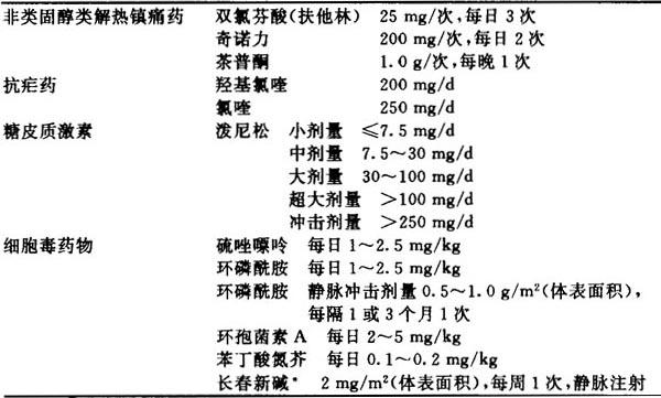 *TPI梅毒螺旋体制动实验;**FTA-ABS 荧光螺旋体吸附实验 【治疗】: 对全身症状轻,仅有皮疹、关节炎、轻度胸膜炎的SLE患者可不用激素,仅用氯喹(CQ)或羟基氯喹(HCQ)等药和NSAIDs治疗(见表9-2),但对全身症状重,有明显脏器损害的患者则必须用激素和(或)其他药物。 表9-2 治疗SLE的常用药物