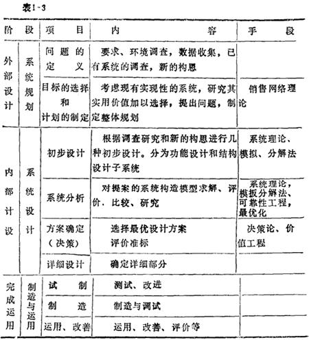 | 释义 | 系统设计内容 所谓系统设计,就是把系统工程的基本原理应用于工程设计。通过系统分析和系统综合等一系列步骤,寻求出合理的技术方案。其基本内容为: 1.明确系统的整体功能目标和约束条件 所谓系统,就是有两个以上相互联系的要素组成的功能整体。任何技术对象和技术过程都可以看成是由各种技术要素组成的技术系统。功能是指系统把输入转换为输出的能力。比如车床是个技术系统,其功能就是车削,因此,在进行系统设计时,必须明确整体功能目标。为了进一步明确系统的整体功能目标,还必须对系统和环境的相互作用关系进行分析。若能全面认识环境对系统的干预和限制以及系统对环境产生的影响和后果,并从系统对环境的最佳角度考虑问题,就可以合理地确定系统的整体功能目标。 制约条件一般是指环境、材料、资金、信息、技术、法律以及可靠性、体积形状、重量、使用维修条件、安装、运输、贮存条件、美观条件等。 2.系统的分解和综合 系统的分解与综合,是系统设计的重要内容之一。不论多么大而复杂的系统,如果分解为适当的若干子系统,就能以积累的经验和知识予以处理。 分解的方法常有:按结构要素分,如船舶可分为船体和发动机等;按功能要素分,如温度、速度等;按时间序列分;按空间可进行平面分解和多级分解。 分解的原则:分解要便于以后综合,如果分解太细,就很难得到最佳综合;要选择子系统间相互关系薄弱处分解;保持子系统间相互关系和子系统与整体间的关系完整。所谓综合是系统分解的逆过程。在分解和综合的过程中值得注意的是可能形成许许多多的技术方案。为了限制方案的数量,常常要对子系统进行预测,把最有利于达到整体功能目标的子系统保存下来,淘汰不符合整体功能要求的子系统,这样可以减少评价和定型设计的工作量。 3.评价并选出最佳方案 4.定型设计 定型设计详见图3-2。