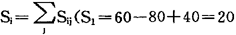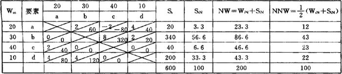 上式右边的第一项是考虑各项目独立时的最初评价值,第二项是由于相互干涉产生的评价值。例如,表2.1.7-2所列的a、b、c、d四个评价对象,其最初的评价值WiN被给定为20、30、40、10,相关度βij给定为β12=2,β13=-2,β14=4,β21=0,β23=8,……时,就可对各项目计算Siij=βijDi,即S12=2×30=60,S13=-80,S14=40,S21=0,S23=320,……。并可求得各项目i的相关度 表2.1.7-2