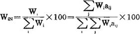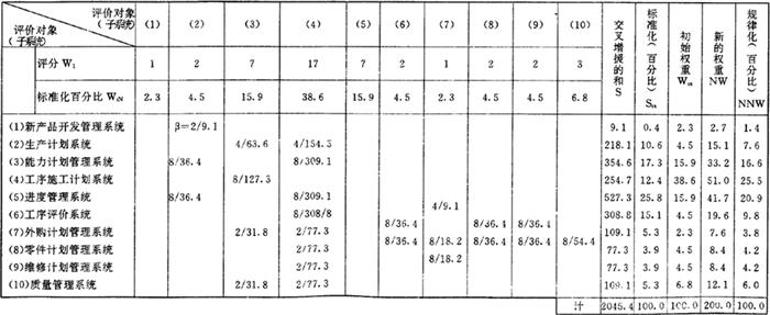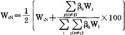 考虑各项目间的相关程度,用βij表示由于j的产生而对i带来的影响。一般,βij≠βji,这时i和j都是评价项目。当j的产生对i的产生起促进作用时,用“+”号表示,起抑制作用时用“-”号表示。根据相关的程度,可对βij取1、2、4、8的指数函数值。 用上述的βij代替最初的评价值WiN,并考虑到新的评价值WiN时,则可变成下式: