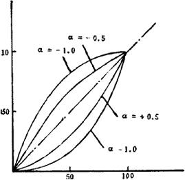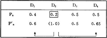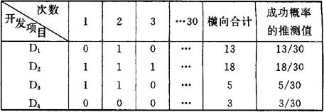 假如a为线性,则可用下式给出: 式中,K是由模型决定的值,可取-1或+1;S表示相关强度的系数,其值为O≤S≤1。 图2.1.7-2表示P′n和Pn的关系的实现概率。图中的对角线表示无关系模型,对角线的上方各线表示促进式模型(-1<a<0),对角线的下方各线表示抑制式模型0<a<1)。由Pn算出P′n时,如考虑表2.1.7-4所示的开发项目及其初期概率,则可以此为基础对各项目制成概率(P)表2.1.7-5、交叉影响矩阵(CIM)表2.1.7-6和成功失败(SF)表2.1.7-7。计算P′n的顺序为:第一步,从P表的D1中任意选出其中的Dk(这里的K=2)。第二步,由概率Pk模拟发生的事项(以P2=0.2试验D2的成功或不成功)。第三步,如成功则将P表和SF表的P2作为1,并根据CIM表通过从Pn到Pn的变换式对P1、P3、P4进行变换;不成功,就以P2为0,P1,P2,P4,无变更。第四步,将剩下的D1、D3和D4按第三步修正的概率对事件的发生进行模拟,使P表的全部项目按第三步的顺序变换到0或1,然后将其计入SF表中。第五步,使第一步到第四步的顺序返复N次,将其结果Sij(i=1-4,j=1-N)记入SF表中。第六步,将SF表中横向合计