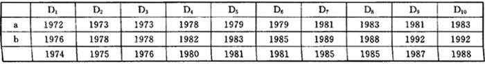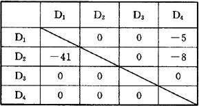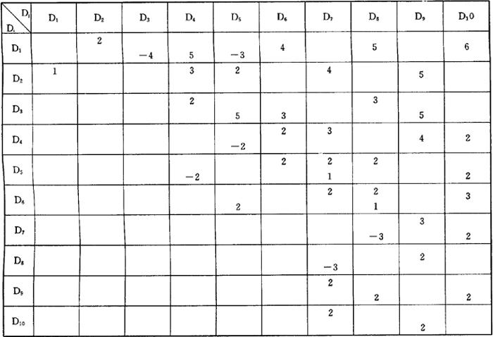 当开发项目为D1、D2、……多个时,由于这些项目的成功,对Dj的综合效果来说,可分为根据社会的需要提出的△μj/i(N)和从技术上考虑的△μj/1(T)来评价求解。例如,有10个开发项目,并令其时间间隔△t为一年,则各开发项目的aj、mj、bj可由表2.1.7-8算出。利用表2.1.7-9,以△μj/i(T)为上段,△μj/i(N)为下段,对Di给Dj的影响进行1000次模拟,就可得到D1出现的次数 表2.1.7-8 各开发项目的预想年