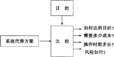 5.费用效果分析法 这是根据系统的效果和费用的分析结果,对系统进行评价的一种方法。其构成如图2.1.7-4。它主要是决定目标尺度和环境的定量比,以及同系统特性和环境特性的目的尺度结合问题。另外,在对代替方案进行评价时,还要充分考虑难以定量化的不确定性因素。为此,在这种分析方法中,主要分析的问题是:(1)系统的目标是什么?(2)提案系统何时可以使用?(3)系统达到目的的程度如何?(4)系统的开发和运行费用需要多少?(5)实现系统目标的最优策略是什么?(6)在预定的系统特性或估计的费用中,所包含的风险或不确定因素是什么。