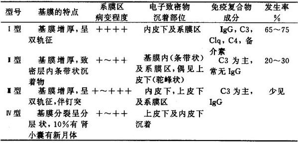 | 释义 | 系膜毛细血管性肾小球肾炎 系膜毛细血管性肾炎又称膜增生性肾炎,占原发性肾小球疾病的10%~20%。临床表现为肾病综合征伴血尿、高血压及肾功能损害,部分患者伴有持续性低补体血症,其病理特点为肾小球基膜增厚、系膜细胞增生及系膜基质扩张,一部分患者系膜基质扩张,将肾小球分割成若干小叶区,又叫分叶性肾炎。根据病理类型分为四型。 【诊断】 1.临床表现 (1)本病好发于青壮年,男>女,老年人少见。Ⅰ型年龄24±16岁,Ⅱ型年龄较小,为16±11岁。 (2)发病前常有前驱感染(约60%~70%),发病较急时可呈急性肾炎综合征(20%),亦可隐匿起病。几乎100%均有血尿,常为肉眼血尿。蛋白尿多为非选择性,60%表现为肾病综合征(国内北医统计肾病占14%)。80%~90%伴有高血压。病变持续发展,半数以上患者逐渐肾功能减退,无自愈倾向。本病起病初即呈现正细胞正色素性贫血现象,与肾功能减退程度不成比例。可能与红细胞表面补体激活有关,也可能因毛细血管病变引起红细胞寿命缩短,表现为面色苍白、乏力、气短。 (3)血C3,CH50持续降低,部分患者C3NF,CIC及冷球蛋白可阳性。 2.辅助检查 (1)早期呈正细胞正色素性贫血。 (2)有肾功能减退者,BUN,SCr上升,Ccr下降。 (3)确诊主要靠肾活检,典型的病理改变如下: 1)光镜 见系膜细胞及系膜基质弥漫重度增生,并插入到基膜与内皮细胞之间,使毛细血管襻广泛增生,呈双轨征。 2)电镜 系膜区及内皮下可见电子致密物。 3)免疫荧光 见大量C3,伴或不伴IgG,呈颗粒样沉积于系膜区及毛细血管壁。 3.分类 临床上可将病理改变分为四型,它们的特点及区别可见表5-1。 表5-1 系膜毛细血管性肾小球肾炎病理分类
