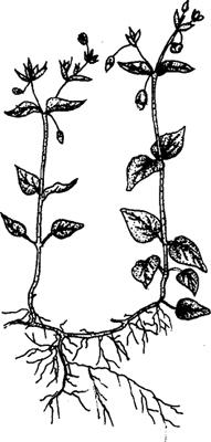 图2-30 繁缕 〔学名与别名〕 Stellaria media(L.)Cyr. 鹅肠草。 〔形态特征〕 越年生或一年生草本,高10~30厘米。茎自基部分枝,平卧或近直立,单侧有1列短柔毛。叶对生,下部叶有柄,上部叶无柄;叶片卵形,先端尖,全缘。花序聚伞形,花单生于叶腋或疏散排列于茎顶;萼片5枚,披针形,边缘膜质,有柔毛;花瓣白色,5枚,短于萼片,先端2深裂几达基部。蒴果卵形或长圆形;种子肾状卵圆形,略扁,褐色,密生同心排列的小瘤状突起。 幼苗淡绿色,子叶卵状披针形,有柄;初生叶2片,三角状卵形,有柄,有毛。 〔生物学特性〕 种子繁殖,幼苗或种子越冬。种子发芽的最低温度为2℃,最适12~20℃,超过30℃不发;最适土层深度为1厘米,最深限于2厘米。 在我国中部地区,冬麦田9~11月集中出苗,大秋作物田可于5~9月分散出苗。秋苗,4月开花结实,5月渐次成熟,种子约经2~3个月休眠后萌发。 繁缕较耐低温,可在2℃的条件下生长,在-10℃时存活。并具有“垫状生长”的特性。种子繁殖量大、生活力强,整株可结籽500~2500粒;浅埋的种子可存活10年以上,深埋的可存活60年以上。 〔分布与危害〕 广布我国中南部地区,黑龙江、河北、山西、陕西、甘肃等北部地区亦有分布。生于较湿润的农田、路旁或溪边草地。主要危害小麦、油菜、绿肥及蔬菜,其次对豆类、棉花、甜菜、薯类、果树等也有危害。此外,还是蚜虫、红蜘蛛的越冬寄主。 |