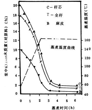 由于红麻皮原料中木质素含量较秆芯部低,因而在整个蒸煮过程中,红麻皮纸浆中木质素含量均低于秆芯浆,麻皮较秆芯易于蒸煮成浆。