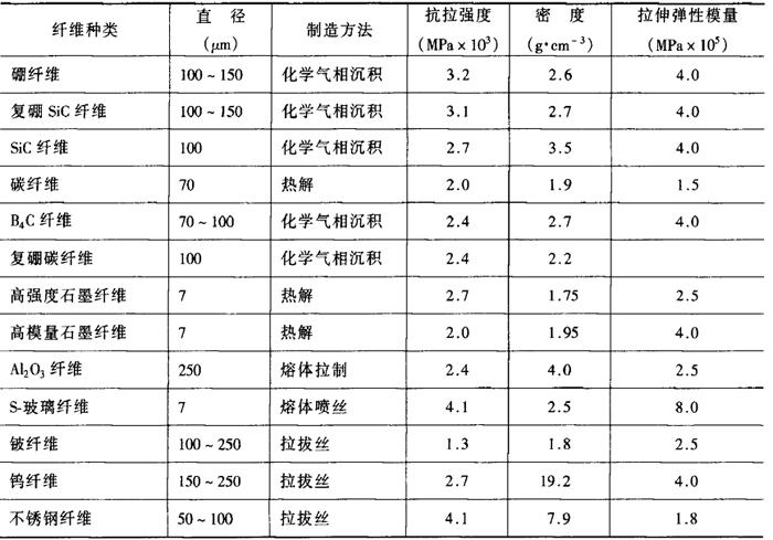 常用的纤维有硼纤维、石墨纤维、SiC纤维、Al2O3纤维、B4C纤维、钨纤维、不锈钢丝等,这些纤维具有很高的强度、模量及很低的密度,用于增强金属时,可使强度显着提高,而密度变化不大。表2-10-1给出了常用纤维的性能。常用的金属基复合材料体有铝、钛、镁、铜及镍等。纤维增强金属基复合材料的主要制造方法包括扩散结合法、熔融金属渗透法、铸造法、等离子喷涂法、电镀法及挤压法等几种。表2-10-2及2-10-3给出了几种典型复合材料的性能。