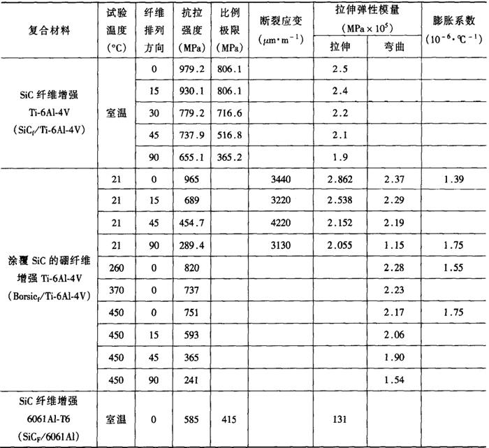 表2-10-2 SiC纤维增强Ti基复合材料的性能(SiC的体积分数为28%)[2]