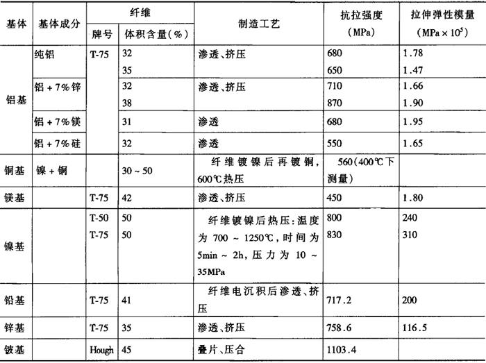 表2-10-3 石墨纤维增强的几种金属基复合材料的性能[1]
