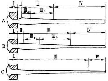 图11-1 液体细流形成的分段图 Ⅰ-为入口段 Ⅱ-为恒定流动段 Ⅲ-细流出口段 Ⅳ-细流受力变形段 由图11-1可知:第一区为入口段,即液体进入孔道;第二段为液体在孔道中恒定流动;第三段为液体细流出口段;第四段为细流受外力作用发生形变,和纺丝细流受冷却介质作用固化成型的阶段。 喷丝孔道的横面形状也将会大大地影响液体的流动过程。若孔道锥形入口的长度达总长的2/3以上时,将有利于液体的流动,减少液体的入口效应,使液体的入口能量损失大大减少,有利于产生均匀的速度场,如图11-2。由图11-2可知,圆柱形入口孔的能量损失比圆锥形的要大得多。