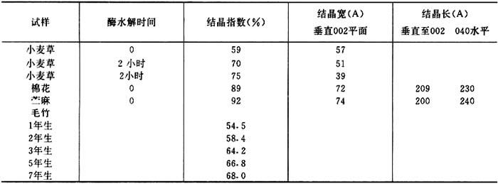 式中,1429cm-1谱带属于CH2的剪切振动,893cm-1谱带属于糖甙的振动和C1变形振动。1372cm-1谱带为C-H弯曲振动,2900cm-1谱带为C-H和CH2伸缩振动。 表2-9-14为几种非木材原料纤维素的结晶度数据。棉、麻纤维素的结晶指数较禾本科植物高。毛竹纤维素的结晶度随竹龄增加而提高。 表2-9-14 非木材原料纤维素的结晶度