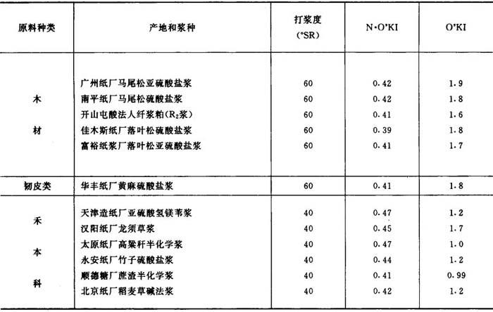 表2-9-15为轻工业部造纸工业科学研究所测定的我国十二种纸浆纤维素结晶度的数据。由草浆与木浆的比较可以看出,木浆的O’KI高于草浆,而草浆的N·O’KI高于木浆。这可能是因为草浆中含有较多的4-0-甲基葡萄糖醛酸基-阿拉伯糖基—木聚糖,由于CH3的弯曲振动的影响,使1372cm-1谱带增大,致使所测草浆的N·O’KI纤维素结晶指数偏高。因而对于草浆,适于用O’KI来衡量纤维素结晶度的大小。 表2-9-15 十二种浆的红外结晶度