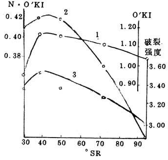 图2-9-4 稻麦草烧碱-蒽醌浆打浆过程中纤维素结晶度与强度的变化 1-O′KI 2-N.O′KI 3-破裂强度