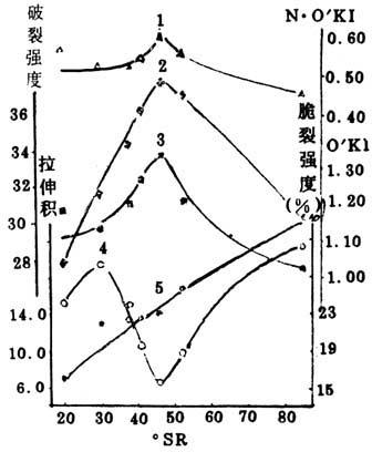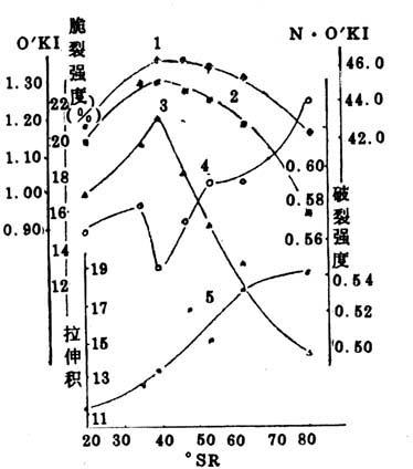 图2-9-6 芦苇亚硫酸盐浆打浆过程中纤维素结晶度与强度的变化 1-N.O′KI 2-破裂强度 3-O′KI 4-脆裂强度 5-拉伸积 由图可见,未漂稻麦草烧碱——蒽醌法浆和芦苇硫酸盐浆及亚硫酸盐浆在打浆过程中,纤维素的红外结晶度指数(N·O’KI和O’KI)在40°SR以前有所增加,而在40°SR以后迅速降低。破裂强度的变化趋势基本上与结晶度指数一致,打浆度40°SR时,结晶度指数和破裂强度均出现最大值。而脆裂强度的变化则相反,在40°SR时呈最低值。拉伸积则随打浆度的提高而增加。同时可以看出,在打浆度基本相同的情况下,芦苇硫酸盐浆的破裂度较亚硫酸盐苇浆大,而脆裂度小。结晶度指数则相近。 |