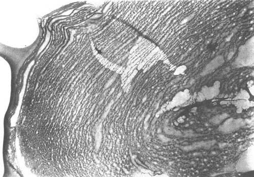 | 释义 | 纤维细胞壁的微细薄层结构 在电子显微镜下可观察到细胞壁的初生壁、次生壁等。实际上,纤维细胞或薄壁细胞的次生壁的各层组织,又是由许许多多的微细薄层构成的。薄层有一定的厚度和间隙,围绕细胞腔形成许多同心圆。层与层之间有较多的木质素和半纤维素。当原料经过适当的化学处理,半纤维素和木质素部分溶除时,分层现象便清晰可见,溶除物愈多,分层愈细。用丁甲酯包埋的超薄切片法,虽夸大了这种分层现象,但便于观察。图2-3-16为漂白苇浆的薄层结构状态,对于水煮苇料,薄层现象只能从KMnO4染色的深浅辨别出来,制成纸浆以后,分层现象明显可见,漂白后层间距离增大,分层更清晰。薄层组织不仅在S2层出现,S1层、S3层也同样是薄层状结构,不仅纤维是这样,薄壁细胞和导管也是这样。另外针叶木的显层现象和芦苇不完全一致,针叶木硫酸盐浆用同样方法超薄切片,显层现象并不十分明显。如进一步处理,针叶木也显层,而阔叶木的显层现象则和芦苇类似,这现象说明芦苇和阔叶木的层间物质较易溶除。