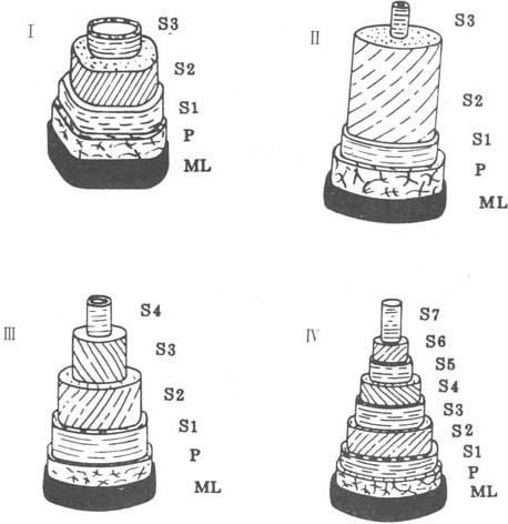 图2-3-16 芦苇纤维的微细薄层结构 TEM×6000 如将纤维中的木质素、半纤维素全部脱除,这种微细薄层的厚度接近于原微细纤维的直径。 归纳起来,禾草类造纸原料的微细结构与木纤维有较大的差异。根据前面各部分所述的结构特点,大体可以概括成四种结构模型(图2-3-17):第一种模型和某些针叶木纤维结构形态相似,但S1层较厚,S2层微纤维角度较大,由ML、P、S1、S2、S3组成。微纤维排列形态:ML——网状,S1——近横向交叉螺旋形,S2——缠绕角为30~40°的平行螺旋形,S3——近于横向交叉螺旋形。第二种模型和某些树皮纤维结构相似,特点是细胞腔极小,细胞壁厚,S2层是细胞壁的绝对主要部分,S2层微纤维的缠绕角约30~45°。稻草、麦草和棉秆纤维主要是由第一、二两种模型的纤维构成的。第三种模型为草类纤维所独有,其特点是细胞壁中层不仅有S2,而S3也是细胞壁中层的组成部分,其厚度往往和S2相当。S2和S3微纤维方向往往是互相反向的。细胞壁内层为S4。芦苇、甘蔗、荻、芒秆等均由第二、三两种模型的纤维组成。第四种模型也为禾草纤维所独有,主要特点是细胞壁中层呈更多层结构,多者可达8~9层以上。各层壁之间松紧程度不一样,微纤维走向不一样,木质素含量不一样,相对厚度不一样,交错排列有S型和Z型两种螺旋缠绕方式,角度随品种略有不同。竹子、龙须草主要由第二、四两种模型的纤维构成。