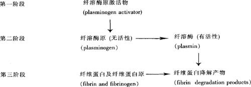 纤维蛋白溶解的基本过程也分为三个阶段:第一阶段是纤维蛋白溶解酶原激活物(plasminogen activator)的释放和形成。纤维蛋白溶解酶原激活物简称为纤溶酶原激活物。第二阶段是无活性的纤维蛋白溶酶原(plasminogen)在纤溶酶原激活物的作用下转变成有活性的纤维蛋白溶酶。纤维蛋白溶酶原简称为纤溶酶原,纤维蛋白溶酶(plasmin)简称为纤溶酶。第三阶段是纤溶酶使纤维蛋白及纤维蛋白原转变为纤维蛋白的降解产物,也就是将大分子的纤维蛋白和纤维蛋白原分解为一些可溶性的小分子的多肽,从而使血块液化。这些可溶性的小分子多肽统称为纤维蛋白降解产物。现将纤维蛋白溶解的基本过程概括如下: