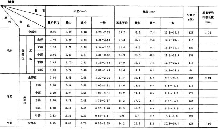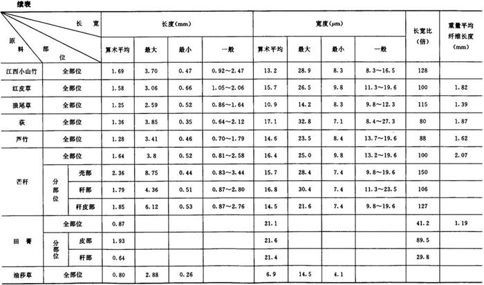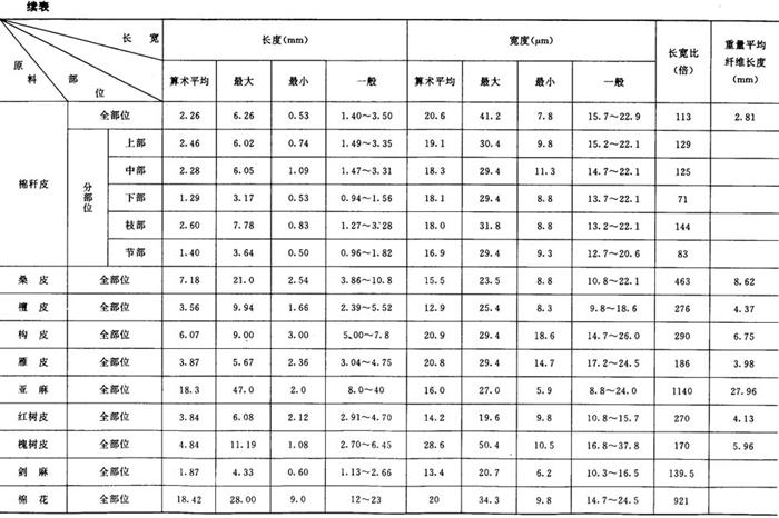 从分析比较表中各项数据,发现以下的几种情况: ①各种原料纤维的长宽度各有不同,但在相同的种类中却有一定的范围。如在长度方面,以棉麻最长,平均18mm以上,树皮类次之(2~8mm),针叶木材第三(3~4mm),竹类第四(1.5~2mm),草类及阔叶木材最短(1~2mm)。在宽度方面,以针叶木材最宽,平均在30~60μm,其他种类都在10~20μm之间。 ②通过分部位观测,大多数原料的纤维,以中部较长,上部次之,下部较短,节部和叶部最短。节部和叶部的结构也比较特殊,常含有较多的非纤维状的杂细胞,这一部分细胞,经常给生产造成困难,影响产品质量。 ③在纤维长宽比的结果中,以棉、麻的倍数最大,平均约为1000倍左右,树皮类次之(170~300倍),竹类第三(120~130倍),草类第四(80~120倍),木材最小(50~70倍)。有人曾把纤维长宽比作为衡量造纸原料质量优劣的标准之一。根据试验的结果来看,理由尚不充分,例如,一般针叶木材较竹类原料好,但其长宽比却次于竹和草。在同类原料中也没有明显的规律,根据实际使用情况,马尾松和落叶松都不如鳞松好,稻草也不及甘蔗渣,但其长宽比恰恰相反。 ④龙须草的纤维细长而柔软,杂细胞也较少,是草类原料中较好的原料之一。各种非木材纤维长宽度比较如表2-5-1所示。 |