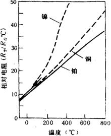 式中:n为单位体积内的自由电子数,e为电子电量,m为电子的质量,τ为特性时间,又称为弛张时间。在纯金属中,弛张时间是公式(4.5-1)中唯一随温度变化的量。在半导体中,载流子的数目n对于温度的变化要敏感得多。 高温时,由于分子运动加剧、弛张时间τ减小,则电阻率ρ增大。该理论在高温时与实际情况比较相符,它只是定性地表达电阻随温度的升高而加大的事实,并不能准确地描述其定量关系。量子力学的观点认为,金属的电阻由两部分组成,一部分电阻与温度无关,另一部分电阻是由电子和离子的热振动的相互作用产生的,这部分电阻与温度有关。导电理论是十分复杂的,涉及各种过程。目前理论研究只能指出金属、合金或半导体电阻-温度曲线的一般形状,定量的理论计算尚不能令人满意。因此,实用中的电阻温度计的电阻-温度曲线往往以简单的经验公式描式。 纯金属的电阻与温度的关系可表示为: Rt=R0(1+At+Bt2+Ct3+…) (4.5-2) 式中:Rt为温度t时的电阻;R0为参考温度下的电阻,A、B、C是与材料有关的常数。 常用的金属电阻温度计有铂、铜、镍电阻温度计。其中铂电阻温度计最为重要。铜电阻温度计范围为-200~+150℃,在工业测温中应用较广,而镍电阻温度计的应用,目前已日趋减少。图4.5-1是铂、铜和镍的电阻温度系数曲线。
