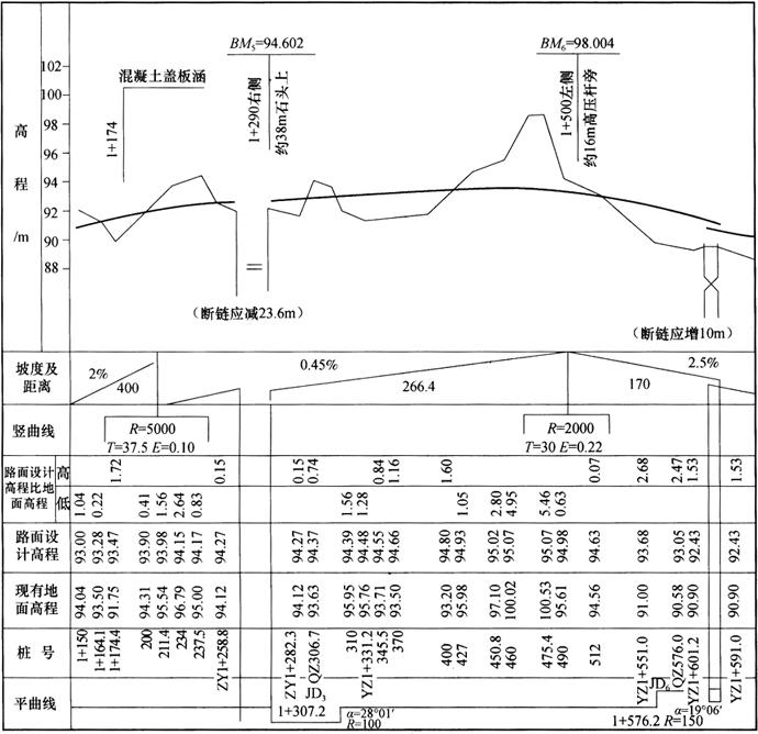 | 释义 | 纵断面图的绘制 1.纵断面图的绘制 纵断面图是以中桩的里程为横坐标,以中桩的地面高程为纵坐标绘制的,展绘比例尺,里程(横向)比例尺应与线路带状地形图的比例尺一致,高程(纵向)比例尺通常比里程(横向)大10倍,如里程比例尺为1∶1000,则高程比例尺为1∶100。纵断面图应使用透明的毫米格纸的背面自左至右进行展绘和注记,图幅设计应视线路长度、高差变化及晒印的条件而定。纵断面图包括图头、图尾、注记、展线四部分。图头内容包括高程比例尺和测图比例尺。设计应注记的主要内容(如桩号、地面高、设计高、设计纵坡、平曲线等),因工程不同也不一样。 当中线加桩较密,其桩号注记不下时,可注记最高和最低高程变化点的桩号,但绘地面线时,不应漏点。中线有断链,应在纵断面图上注记断链桩的里程及线路总长应增减的数值,增值为长链,地面线应相互搭接或重合;减值为短链,地面线应断开。 纵断面图是进行线路竖向设计的主要依据。不同的线路工程其具体内容有所不同,下面以道路设计纵断面图为例,说明纵断面图的绘制方法。 如图11-29所示,在图的上半部,从左至右绘有两条贯穿全图的线,一条是细线,表示中线方向的地面线,是以中桩的里程为横坐标,以中桩的地面高程为纵坐标绘制的。里程的比例尺一般与线路带状地形图的比例尺一致,高程比例尺则是里程比例尺的若干倍(一般取10倍),以便更明显地表示地面的起伏情况,例如里程比例尺为1∶1000时,高程比例尺可取1∶100。另一条是粗线,表示带有竖曲线在内的纵坡设计线,根据设计要求绘制。