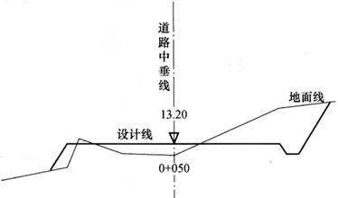 图11-29 道路纵断面图 在图的顶部,是一些标注,例如水准点位置、编号及其高程,桥涵的类型、孔径、跨数、长度、里程桩号及其设计水位,与某公路、铁路交叉点的位置、里程及其说明等,根据实际情况进行标注。 图的下部绘有七栏表格,注记有关测量和纵坡设计的资料,自下而上分别是平曲线、桩号、地面高程、设计高程、设计与地面的高差、竖曲线、坡度及距离。其中平曲线是中线的示意图,其曲线部分用成直角的折线表示,上凸的表示曲线右偏,下凸的表示曲线左偏,并注明交点编号和曲线半径,带有缓和曲线的应注明其长度,在不设曲线的交点位置,用锐角折线表示;里程栏按横坐标比例尺标注里程桩号,一般标注百米桩和千米桩;地面高程栏按中平测量成果填写各里程桩的地面高程;设计高程栏填写设计的路面高程;设计与地面的高差栏填写各里程桩处,设计高程减地面高程所得的高差;竖曲线栏标绘竖曲线的示意图及其曲线元素;坡度栏用斜线表示设计纵坡,从左至右向上斜的表示上坡,下斜的表示下坡,并在斜线上以百分比注记坡度的大小,在斜线下注记坡长。 2.横断面图的绘制 根据横断面测量得到的各点间的平距和高差,在毫米方格纸上绘出各中桩的横断面图。水平方向表示距离,竖直方向表示高程。为了便于土方计算,一般水平比例尺应与竖直比例尺相同,一般采用1∶100或1∶200的比例尺绘制横断面图。如图11-30中的细实线所示,绘制时,先标定中桩位置,由中桩开始,逐一将特征点画在图上,再直接连接相邻点,即绘出横断面的地面线。 横断面图画好后,经路基设计,先在透明纸上按与横断面图相同的比例尺分别绘出路堑、路堤和半填半挖的路基设计线,称为标准断面图,然后按纵断面图上该中桩的设计高程把标准断面图套在实测的横断面图上。也可将路基断面设计线直接画在横断面图上,绘制成路基断面图。 图11-30粗实线所示为半填半挖的路基断面图。根据横断面的填、挖面积及相邻中桩的桩号,可以算出施工的土、石方量。