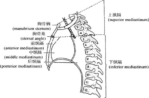| 释义 | 纵隔 纵隔(mediastinum)是左右纵隔胸膜间所有器官结构的总称,其前界为胸骨,后界为脊柱胸段,两侧为纵隔胸膜,向上达胸廓上口,向下至膈。通常以胸骨角平面(平对第4胸椎体下缘)将纵隔分为上纵隔(superior mediastinum)与下纵隔(inferior mediastinum),下纵隔再以心包为界,分为前纵隔(anterior mediastinum)、中纵隔(middle mediastinum)和后纵隔(posterior mediastinum)(图7-23)。纵隔内主要器官有胸腺、心包和心脏、心脏出入口的大血管、食管、气管、支气管、迷走神经、交感干、胸导管、奇静脉、淋巴结、膈神经、心包隔血管及连接组织等。由于小儿纵隔较成人相对地大,柔软而富有弹性,且其周围组织松软而疏松,再加上小儿胸膜较薄,胸膜囊大于肺脏而有贮备空间(窦),所以胸膜腔有较大量积液时,常易引起纵隔器官的移位。